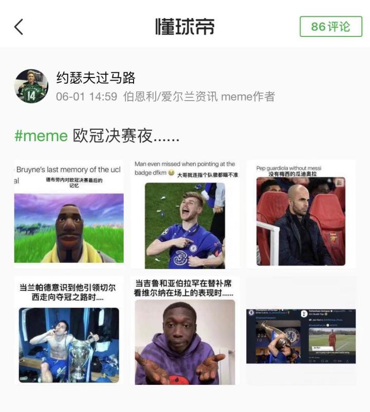 2021年的6月1日,我首次在懂球帝平台上发布了调侃欧冠决赛的meme, 一经推出,反响激烈,当然,在球迷们的留言中有好有坏。在回头看评论的时候,我发现其实每次都会有很多朋友问meme到底是什么东西。那么这种meme文化,到底是什么意思?究竟只是一种调侃,还是一种变相的对自己反感的球员/球队的辱骂呢?