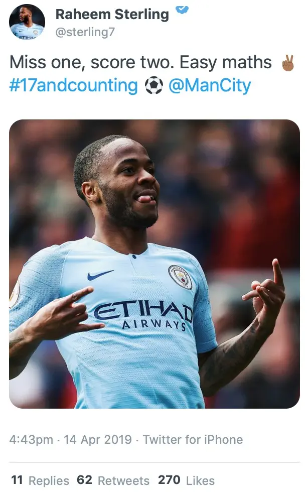 在18-19赛季英超联赛曼城3-1战胜水晶宫的比赛中,“快乐男孩”斯特林虽说在本场比赛梅开二度,但是在开局阶段也因空门没进被球迷口诛笔伐,作为一个常年因错失良机在网上被球迷调侃甚至辱骂的球员,斯特林大大方方的在社交媒体上发文:“吐饼一次,梅开二度,数学嘛,很简单的!”