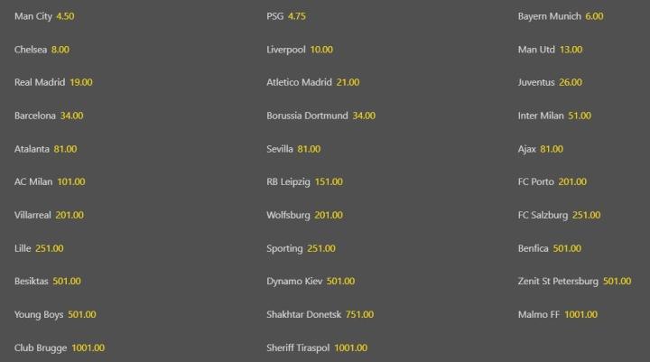拜仁仍位列赔率榜第三位,英超四支参赛球队出现在前六位置。