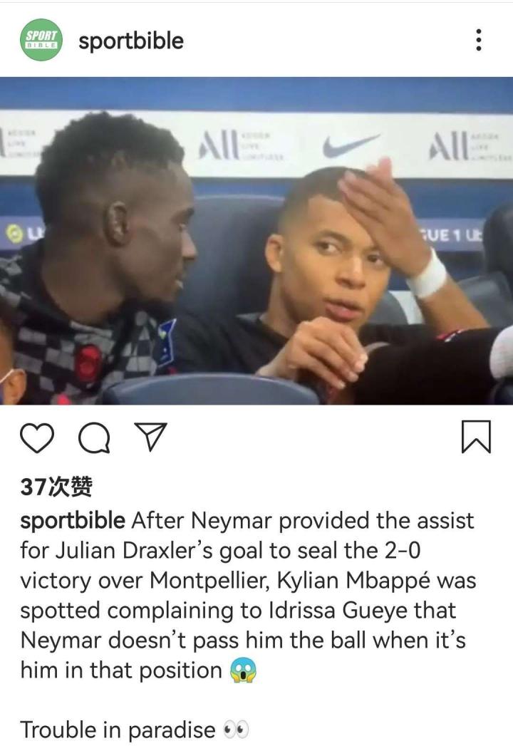 在上周末巴黎战胜蒙彼利埃的比赛中,姆巴佩被镜头捕捉到向队友表达对内马尔的强烈不满。