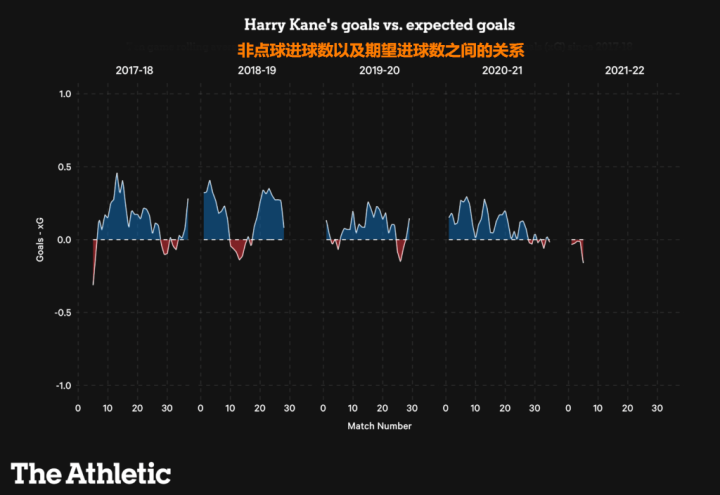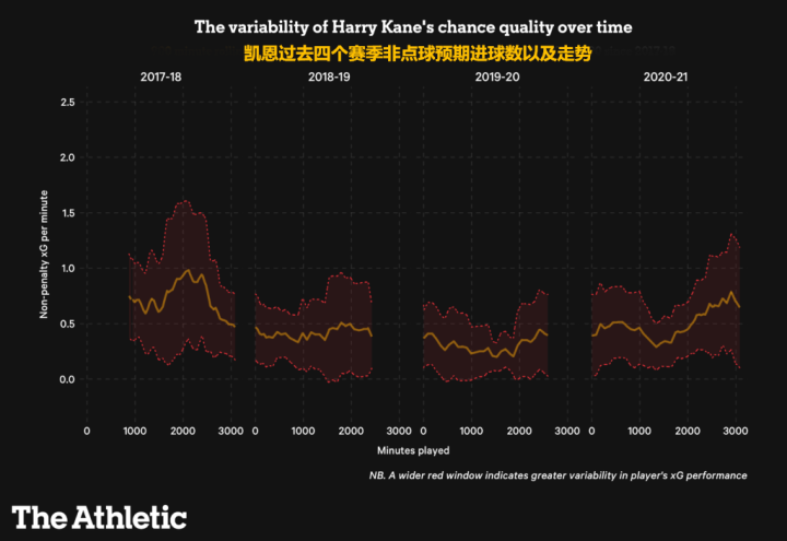 下图是对比过去几个赛季凯恩在平均非点球进球以及预期进球数之间的关系。我们能发现凯恩过去四场的门前表现是低于预期的,放眼过去四个赛季,这种现象放在凯恩身上是比较罕见的。
