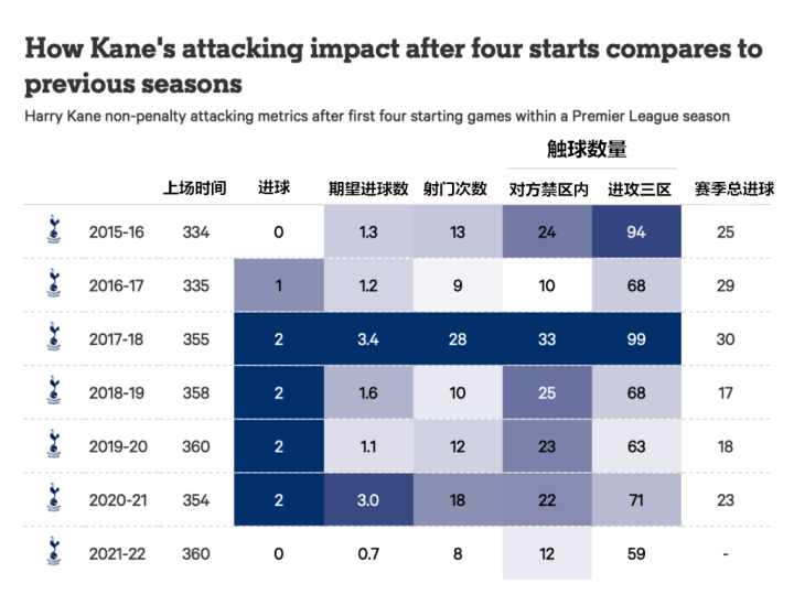 为了说明问题,我们将本赛季凯恩参加的四场联赛,与前几个赛季的联赛前四场数据做出对比。