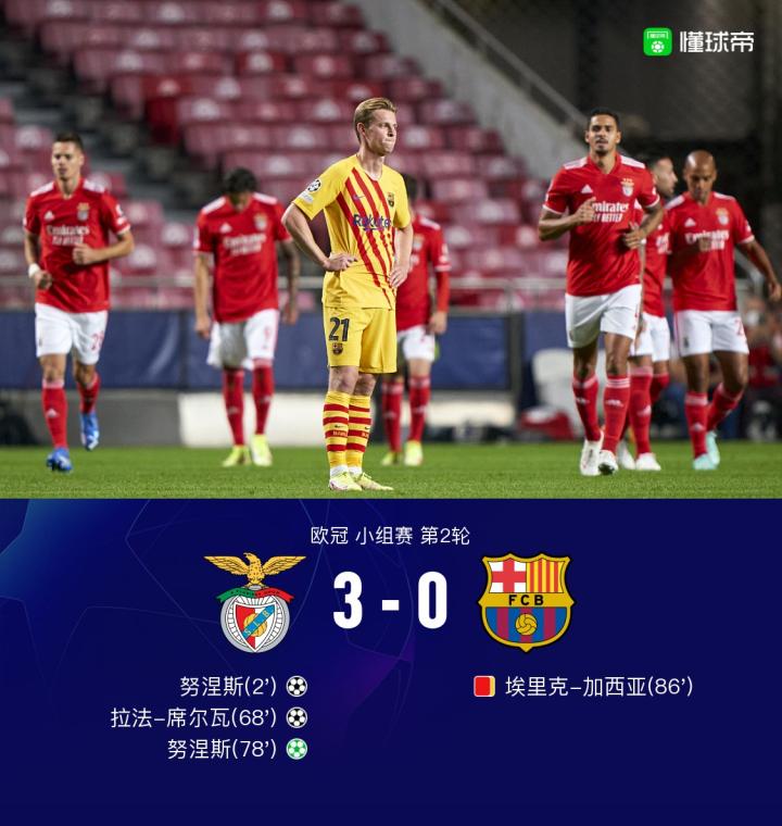 欧冠连续两场0-3!巴萨完败本菲卡,德斯特送点,努涅斯双响