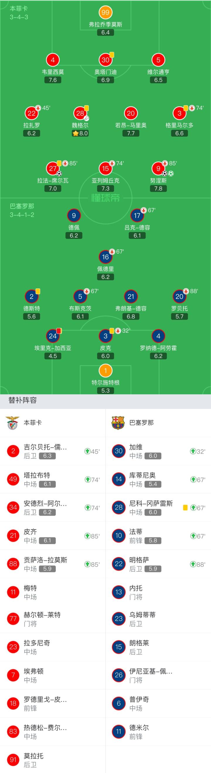 本菲卡首发:99-弗拉乔季莫斯、5-维尔通亨、30-奥塔门迪、3-格里马尔多(74'34-安德烈-阿尔梅达)、4-韦里西莫、22-拉扎罗(45'2-吉尔贝托-儒尼奥尔)、28-魏格尔、20-若昂-马里奥、15-亚列姆丘克(74'49-塔拉布特)、27-拉法-席尔瓦(85'21-皮齐)、9-努涅斯(85'88-贡萨洛-拉莫斯)