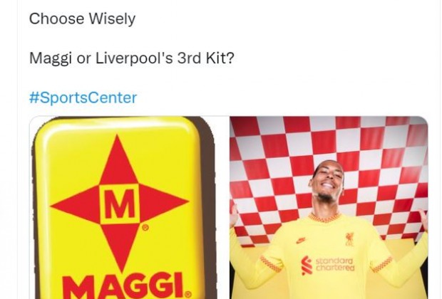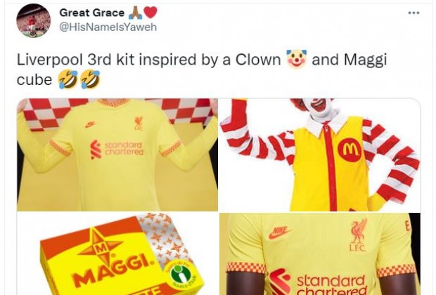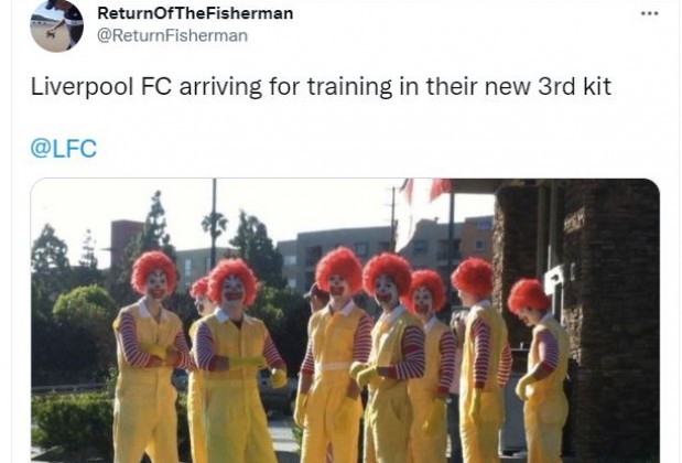 2021年9月初,利物浦发布了新赛季的第三球衣,这样黄红的搭配。不仅令人与失踪多年的麦当劳叔叔联系了起来,还顺便给几个国外牌子带带货。