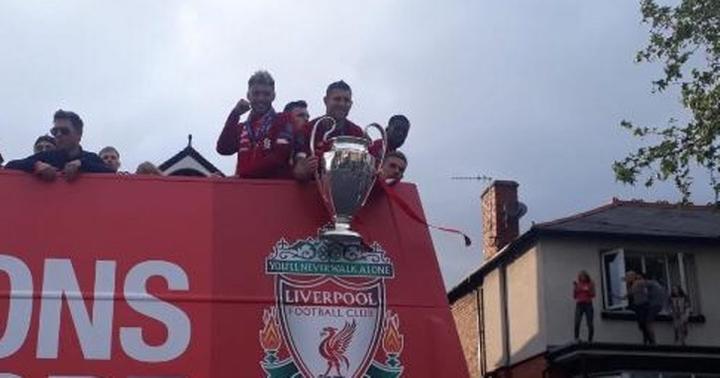 迪瓦恩坐在门外,米尔纳靠在游行车的一侧,车上面写着“We Are Liverpool: This Means More”(我们是利物浦,这意味着更多),红军副队长向迪瓦恩展示了那座闪闪发光的大耳朵杯。