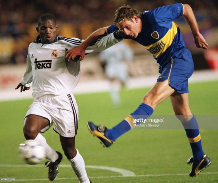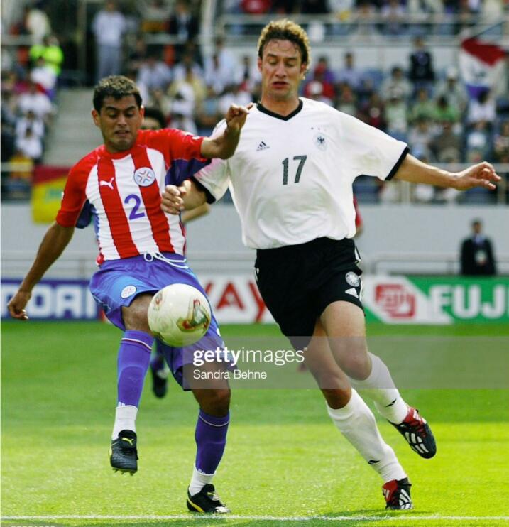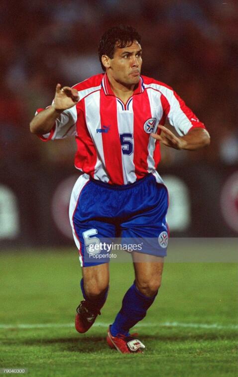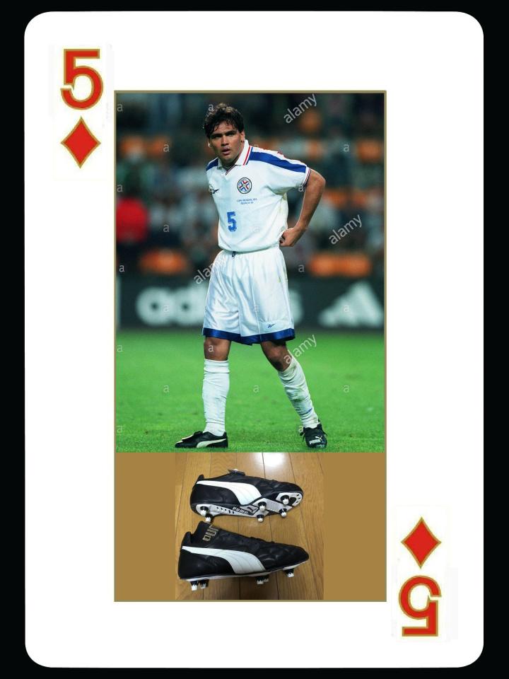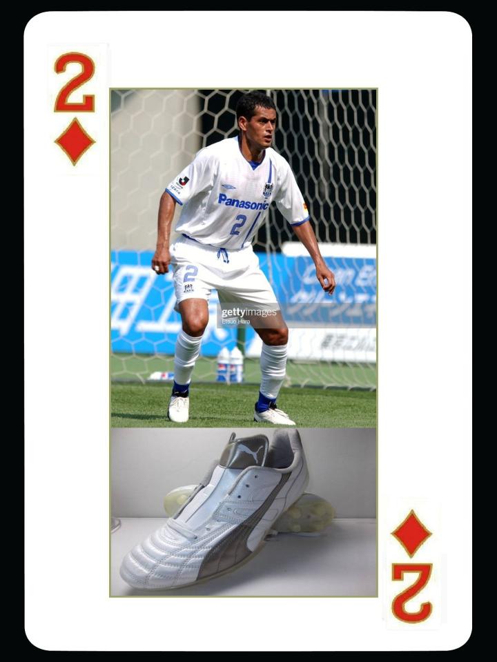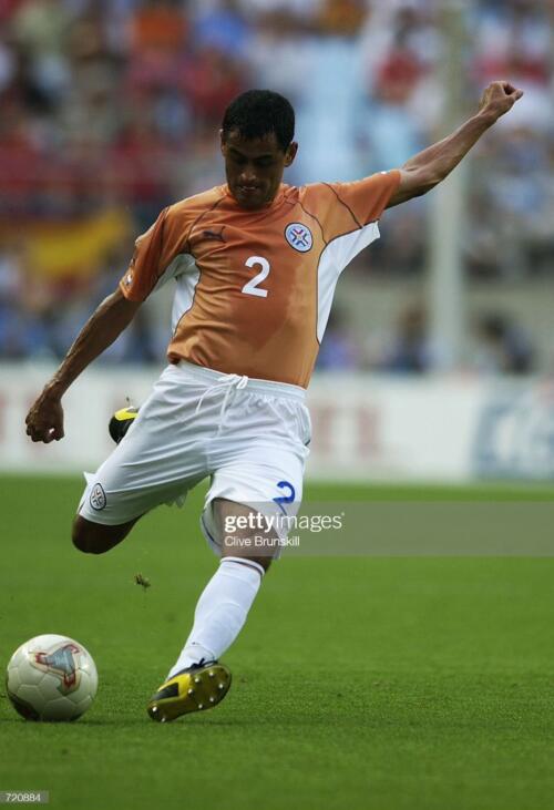 下面这位球员,老球迷肯定认识,1998年和2002年世界杯巴拉圭队的主力右后卫阿尔塞,他当时效力于巴西帕尔梅拉斯队,攻防俱佳,体能出色,还有一脚任意球功夫。是当时南美联赛最佳右后卫,2002年世界杯,阿尔塞穿的黑黄色的del mundo球鞋,打入过南非队一个任意球。估计也是到了日本奇拉维特给他推荐的。此时已经是他受伤后的低谷期,在世界杯结束后,阿尔塞加盟了日本的大阪钢巴俱乐部,在那里他还是继续使用日系的puma球鞋,下面这款白色的球鞋是puma的bonaolo,也是当时非常受欢迎的一款日系puma球鞋。阿尔塞在日本还穿过白色的日产蹴道。