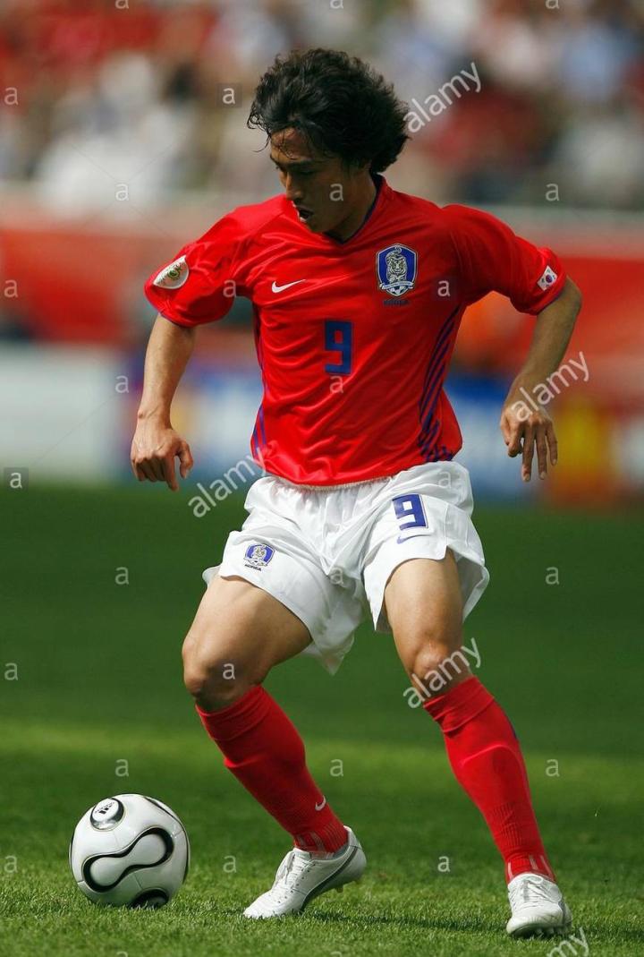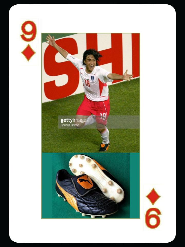 最后一位球员和阿尔塞有比较类似的经历,但他是韩国人,安贞焕。他应该也是在2002年世界杯前在日本采购的日系puma球鞋,因为当时他在佩鲁贾穿的nike的水星,世界杯前他和马明宇还是队友。安贞焕当时买的球鞋是日本产的0255黑橙配色,没想到穿上这款鞋他就开始发飙,在和意大利队的八分之一决赛中一球成名,绝杀了意大利,他的黑橙色球鞋也成为经典。世界杯之后佩鲁贾俱乐部直接和他解除了合约,安贞焕开始日本发展,先后效力清水脉冲和横滨水手,2005年他第二次旅欧,加盟法甲梅斯,之后有辗转德甲杜伊斯堡,当时他穿的球鞋也都是之前在日本穿的日系的puma球鞋。2006年世界杯上,他穿的应该还是最爱的0255球鞋。作为一个韩国人,能成为一款日系足球鞋的座右铭,安贞焕也是前无古人。