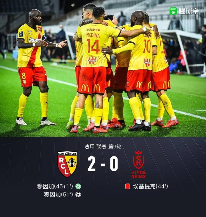 【朗斯2-0十人兰斯近五轮斩四胜,穆因加双响,埃基提克染红】