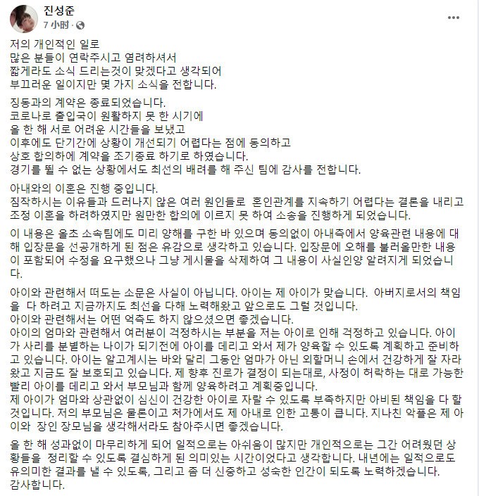 这些情况在今年年初的时候也得到了了所属队伍的谅解,在没有得到同意的情况下,妻子方面就公开了关于孩子养育方面的立场,对此感到十分遗憾。文中包含了可能引起误会的内容,要求修改,但只是删除了帖子,内容被认为是事实。