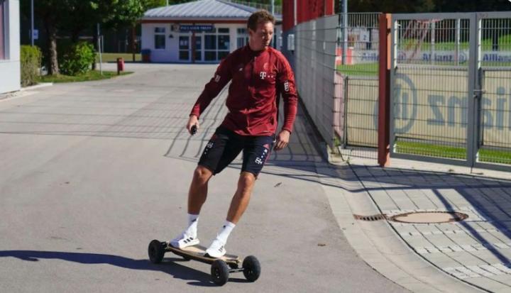 拜仁慕尼黑少帅纳格尔斯曼业余时间非常喜欢运动,最近纳帅滑着滑板前往塞贝纳大街工作。德国媒体《图片报》盘点了纳格尔斯曼的交通工具,从滑板到山地车再到摩托车。