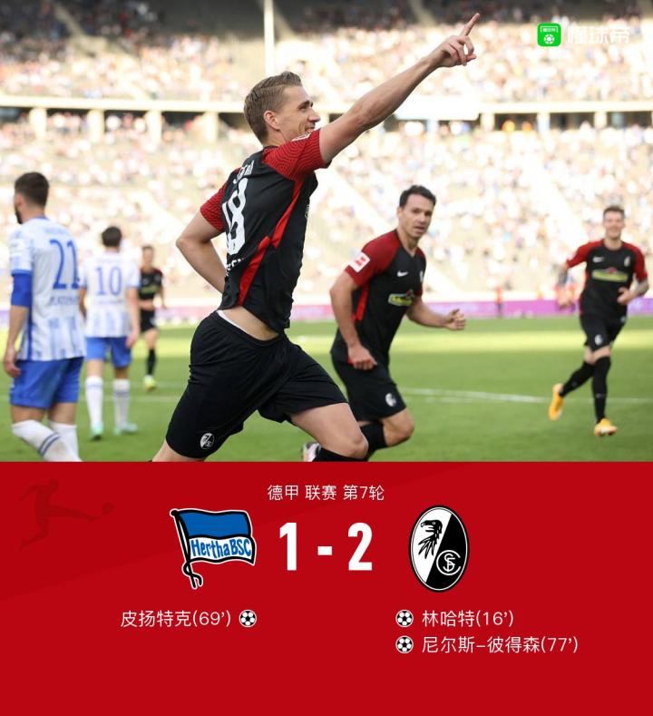 北京时间10月2日21:30,德甲第7轮,柏林赫塔对阵弗赖堡。上半场约维蒂奇任意球造险,京特尔角球助攻林哈特头球打破僵局,下半场米格尔施泰特助攻皮扬特克推射扳平比分,埃克伦坎普射门击中横梁,尼尔斯-彼得森倒钩破门帮助球队将比分再次超出。最终,柏林赫塔1-2弗赖堡。