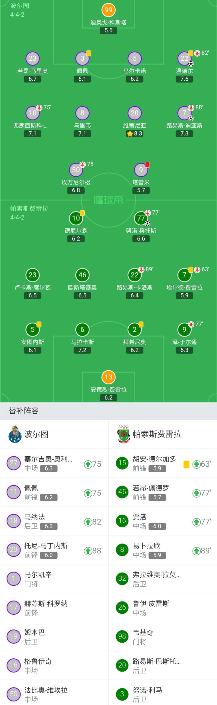 波尔图首发:99-迪奥戈-科斯塔、23-若昂-马里奥、3-佩佩、5-马尔卡诺、22-温德尔(82'18-马纳法)、10-弗朗西斯科-孔塞桑(75'27-塞尔吉奥-奥利韦拉)、8-乌里韦、20-维蒂尼亚、7-路易斯-迪亚斯(88'29-托尼-马丁内斯)、30-埃万尼尔松(75'11-佩佩)、9-塔雷米