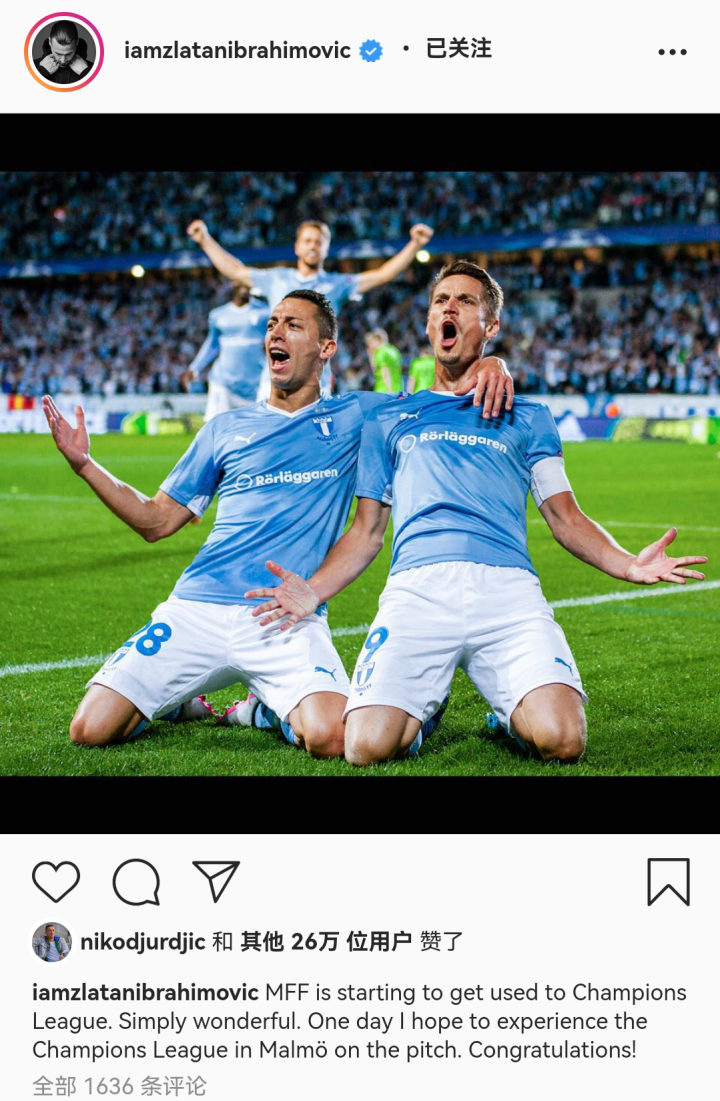 此役过后,作为马尔默培养出来的球员,“大奉先”伊布也对老东家送上了祝贺,他在推特上写道:恭喜!希望有一天,我也能在马尔默参加欧冠联赛。而这条动态的配图正是久尔吉奇与队友罗森贝里庆祝的画面。