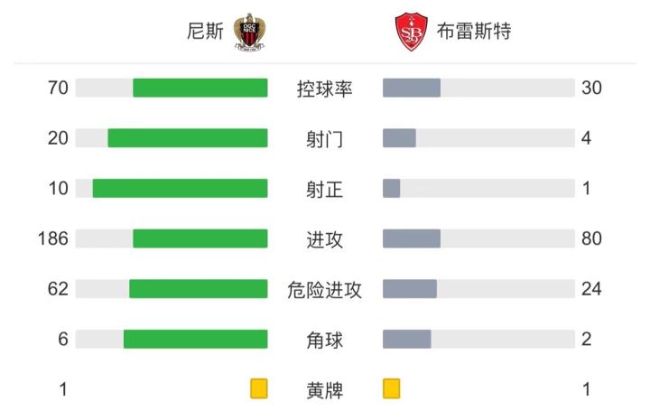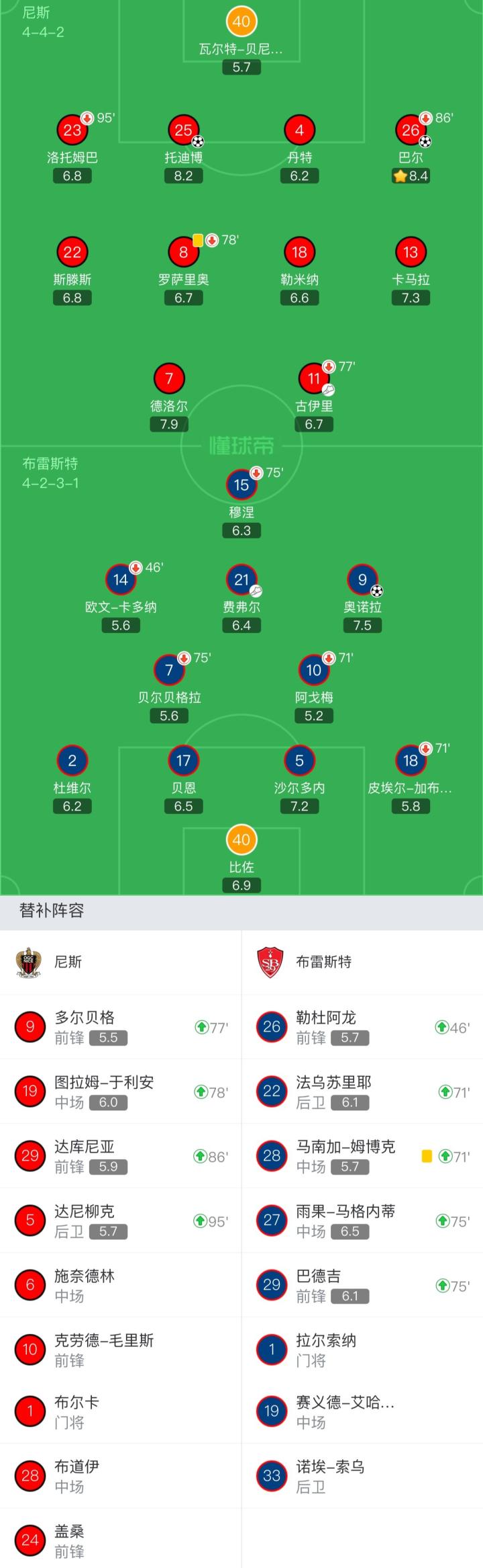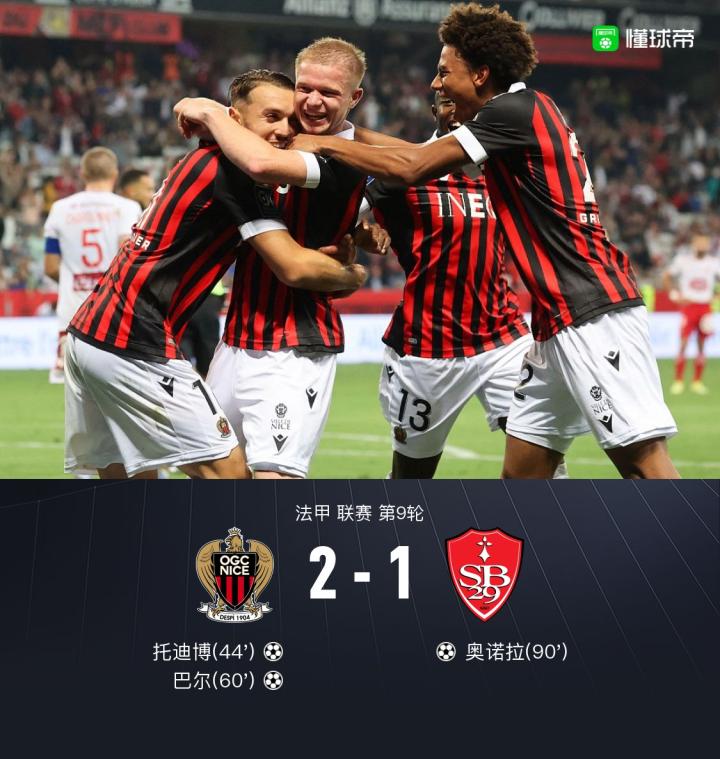 尼斯2-1布雷斯特迎连胜,托迪博抽射破门,巴尔头球建功