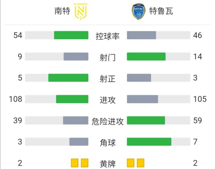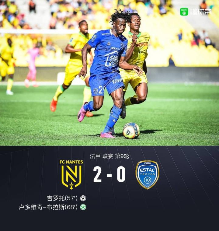 北京时间10月3日21:00,法甲第9轮继续进行,南特坐镇主场迎战特鲁瓦。上半场,热贝尔伤退,热尔松-罗德里格斯屡造威胁。下半场,吉罗托抢点头槌打破僵局,随后卢多维奇-布拉斯点射再下一城。最终,南特主场2-0击败特鲁瓦,后者遭遇四轮不胜。