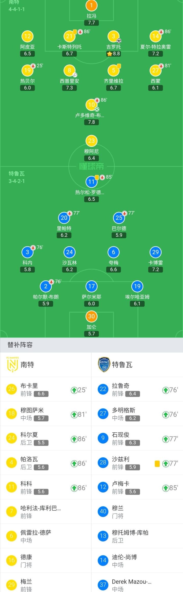 南特首发:1-拉冯、12-阿皮亚、21-卡斯特列托(85'4-帕洛瓦)、3-吉罗托、14-夏尔-特拉奥雷(85'24-科尔夏)、10-卢多维奇-布拉斯(85'11-科科)、8-西普里安、5-齐里维拉、19-热贝尔(24'26-布卡里)、23-穆阿尼、27-西蒙(80'18-穆图萨米)