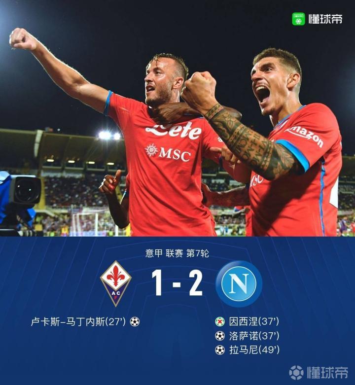 北京时间10月4日凌晨0:00,意甲第7轮,那不勒斯客场挑战佛罗伦萨。上半场,佛罗伦萨通过卢卡斯-马丁内斯的凌空破门取得领先,那不勒斯获得点球,因西涅失点,洛萨诺补射破门扳平比分。下半场,拉马尼头球破门反超比分。全场比赛结束,那不勒斯2-1佛罗伦萨。
