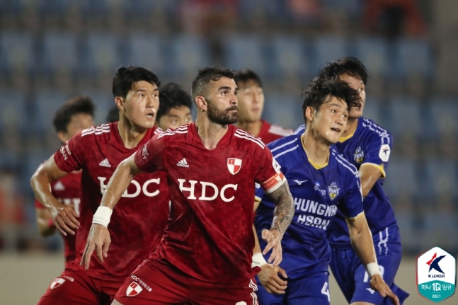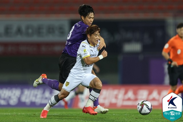 全南天龙的平局,也让大田韩亚市民至少守住了第三的位置。本轮与富川FC1995的比赛,主队一开场就发起了猛烈的攻势,两个边路完全抑制住了对手的防守,但在球传到中路后,往往第二点无法被进攻球员拿到,导致进攻受阻。在顶住了对手的三板斧后,富川利用一次反击抓住了机会,第18分钟,赵玹泽边路传中,门前包抄的前锋李始宪直接迎球抽射破网,0-1!富川领先。
