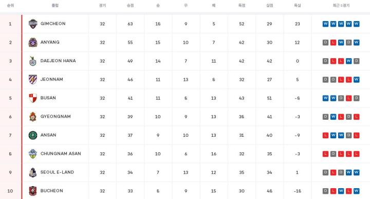 金泉尚武拉开了与FC安养的分差,只要下一轮取胜,一只手就已经触碰到冠军奖杯了。而FC安养、大田韩亚市民、全南天龙、釜山IPark四支球队,将基本上参与季后赛门票的争夺。