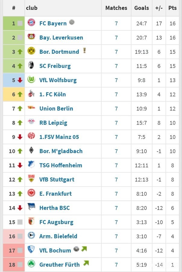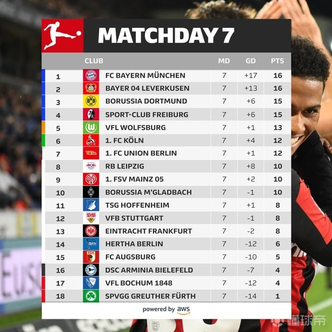 德甲联赛第七轮的比赛已经全部结束,近期状态出色的勒沃库森与爆冷输给法兰克福的拜仁同积16分,暂时领跑积分榜,多特蒙德和弗赖堡位列第二,仅仅落后1分。