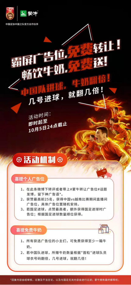 所有获选广告位的小主们,可免费获得至少一箱牛奶。另外,如果中国队进球,所赠牛奶数量根据“首粒”进球队员球衣号码翻倍——譬如说,如果是武磊进球,小主们将获得7箱牛奶!