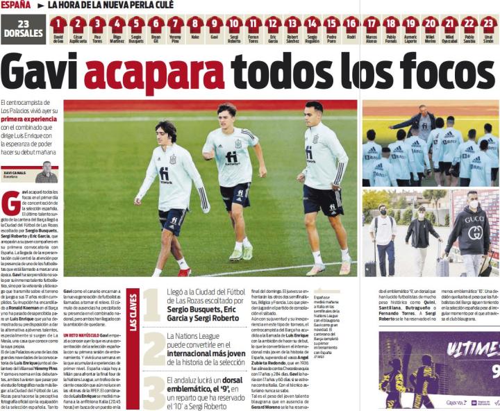 拉玛西亚明珠闪耀伊比利亚 加维在西班牙国家队集训的第一天就垄断了所有人的目光,这名来自拉玛西亚青训营的小球员,在布斯克茨、罗贝托和埃里克·加西亚的陪同下抵达了位于马德里的拉斯罗萨斯足球城(la Ciudad del Fútbol de Las Rozas),加维的入选也标志着西班牙足球将迎来一个新的时代。 征服路易斯·恩里克的不只是加维在比赛中展现出的足球天赋,更是这名年仅17岁的少年所具有的老练和领导力。他的出现让巴萨的科曼无比欣慰,对路易斯·恩里克更是如此。这名同样出自拉玛西亚青训的西班牙国家队主教练,已经开始计划让加维在即将到来的比赛中登场亮相。这很有可能会让加维超越“巴斯克天使”祖别塔·雷东(Ángel Zubieta Redondo)多成为西班牙历史上最年轻的国脚。1936年,雷东多在西班牙对阵捷克斯洛伐克的比赛中登场,那时他的年龄为17岁284天。而如果加维能在本周三西班牙对阵东道主意大利的比赛中出场,他将以17岁60天的年龄打破这一记录。 另一件可以证明加维地位的事请,是由于莫雷诺的缺席,加维得以穿上西班牙国家队的9号战袍,这个号码一直以来都是国家队的传奇人物专属,例如恩里克·卡斯特罗(Enrique "Quini" Castro)、桑蒂拉纳(Santillana)、布特拉格诺 (Emilio Butragueño)和费尔南多·托雷斯。而加维的队友、巴萨第四队长罗贝托也将在国家队穿上象征地位与荣誉的10号战袍,这说明尽管巴塞罗那足球俱乐部正在经历史上最为动荡的时期,但红蓝军团的球员仍然在西班牙国家队占有一席之地。 每体速读 第4-5版