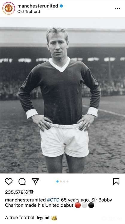 1956年的10月6日,博比-查尔顿上演曼联处子秀,今天曼联官方社媒发文纪念:“就在65年前的今天,查尔顿爵士完成了他的曼联首秀,一个真正的足球传奇!”