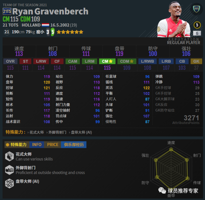格拉芬贝克是一名妖人中场,阿贾克斯的荷兰小妖,被誉为下一个德容(但游戏里他可比德容强多了)。格拉芬贝克拥有出色的控球盘带能力,这么高的个子还有超高的灵活是比较少见的,攻守兼备,是非常不错的B2B中场。缺点也有,体重稍稍轻了点,平衡稍低,逆足只有3。赛季选择方面没有太多选择,直接入21TS就完事了。