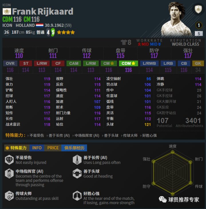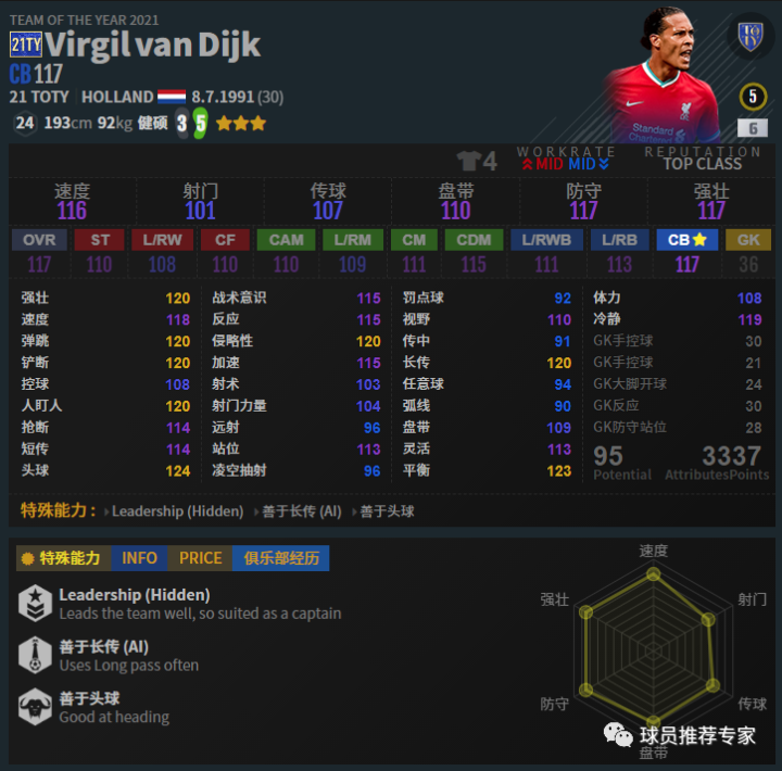 范迪克可以说是毫无疑问的独一档的存在,就像“内马尔6星花式是因为他配得上,小罗6星花式是因为最高只有6星”一个道理,马尔蒂尼、费迪南德等紫级是因为他们配得上紫级,而范迪克紫级是因为最高只有紫级。范迪克是真正意义上完美无瑕的极品中卫,模型劲爆不提,速度还能如此之快,速度快就算了,这么高大还这么灵活,这么灵活就算了,AI还如此之高,使其防守选位非常合理,AI如此之高就算了,身体对抗还这么强,弹跳又好,防空无解。真的想挑毛病都挑不出啊!赛季选择方面基本每一个赛季的范迪克都很棒,具体强化到几级就看各自的经济情况了。