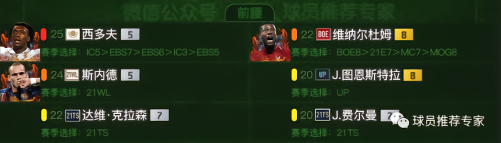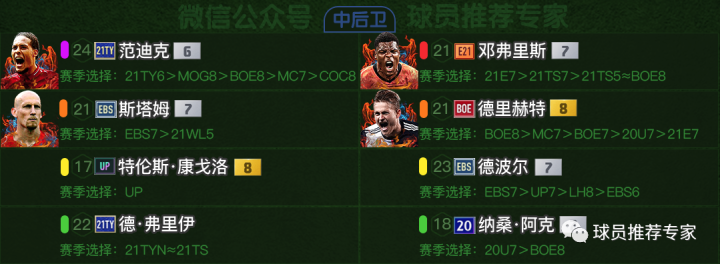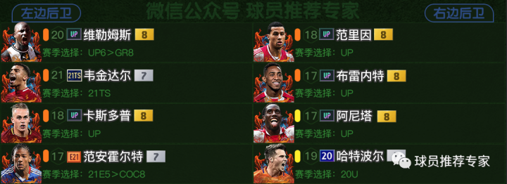 边后卫方面可选的人才蛮多的,这几个UP赛季建议金卡,比7卡强度高不少。韦金达尔、维勒姆斯是最推荐的两位。当然如果范安霍尔特和哈特波尔能金卡那推荐顺位会靠前,不过这俩赛季目前搞金卡较难所以暂时写7卡。