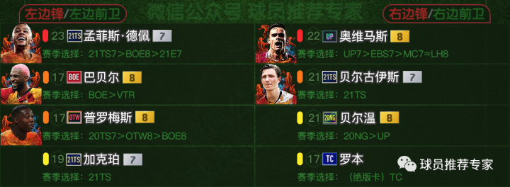 边锋方面人才还是蛮多的,德佩和奥维马斯建议首发,这俩强度确实高,能力也很全面,能传能射,非常推荐。巴贝尔、贝尔古伊斯和普罗梅斯可作为替补选择,加克珀的话终结能力比较一般。