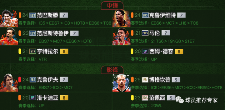 中锋方面范巴斯滕是很不错的选择,但是ICON赛季单卡112能力值想上银可太难了,3卡用着又没意思,所以更推荐EBS,工资也比ICON低一些。范巴斯滕、克鲁伊维特和范尼这几名现实中的顶级中锋本该在游戏里达到更高的高度的,但由于版本问题这几名只达到了橙级,这大大削弱了荷兰套的实力。马伦速度非常快,很契合目前版本,但是3逆足让其终结能力大打折扣。影锋方面“克圣”克鲁伊夫是非常不错的选择,盘带很好,手感极佳,能打前腰组织也能前插射门,是一名非常优秀的影锋。博格坎普说实话FIFA做不出来,游戏里表现只能算一般。