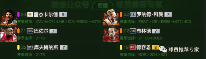 后腰方面里杰卡尔德是首选,罗纳德·科曼与其去打中卫不如来打后腰更舒服。巴佐尔和布林德也是不错的替补人选,状态好也是可以首发的。库夫梅纳斯2逆足可惜了,不然是可以橙级的,德容恩可作为替补选择。