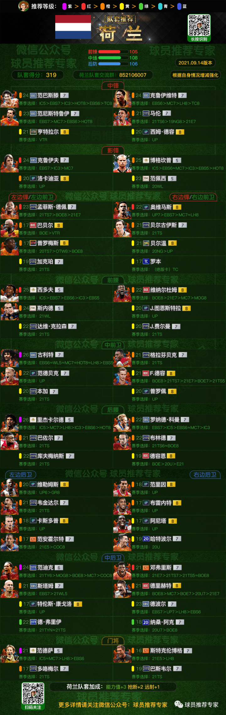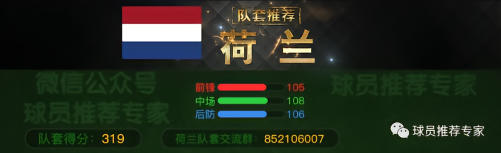 荷兰套还是很强的,很多人印象中荷兰套可能是第一国家队套,但其实不然。目前已统计的国家队套中至少有两个国家队强于荷兰,兄弟萌可以猜一猜是哪两队。中锋范巴斯滕本该是红级甚至紫级级别的中锋,但是由于版本原因,游戏里只能达到橙级,这是比较让人无语的。而克鲁伊维特、范尼这本该红级的中锋也只有橙级,导致荷兰套锋线实力大打折扣,这是比较让人无语的。下个版本头球加强了这几位的地位应该会有所提升。荷兰套每个位置都有人才可用,是目前最顶级的几个国家队套之一。我们可以设定一套规则来反应队套强度。设定紫色12分,红色10分,橙色8.5分(最终结果四舍五入),黄色7分,绿色6分,青色3分,蓝色1分,统计36人大名单的球员的得分(前锋方面:中锋+影锋6名,边锋6名;中场方面:前腰、中场、后腰各4名;后防方面:中卫6名,边后卫4名,门将2名)。根据规则得出荷兰套的36人总得分是:319。