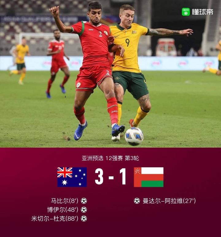 澳大利亚3-1阿曼迎12强赛三连胜领跑,马比尔、博伊尔建功