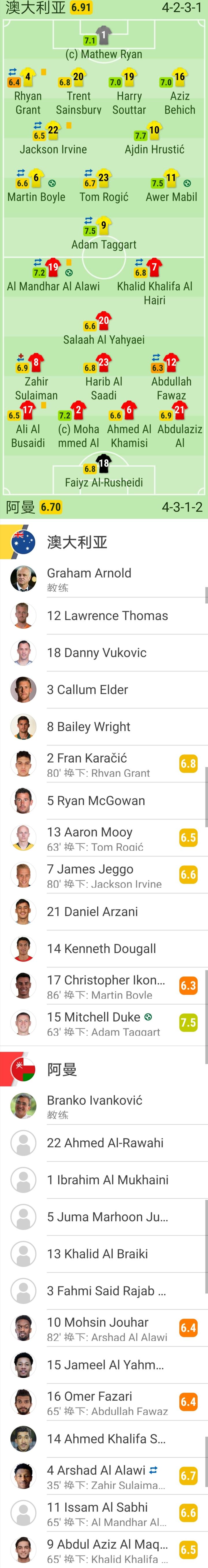 澳大利亚首发:1-马修-瑞安、19-苏塔、20-塞恩斯伯里、16-比伊奇、4-格兰特(79'2-卡拉契奇)、6-博伊尔(85'17-伊孔诺米蒂斯)、10-赫鲁斯蒂奇、11-马比尔、9-塔加特(62'15-米切尔-杜克)、22-杰克逊-欧文(79'7-杰戈)、23-罗吉奇(62'13-穆伊)