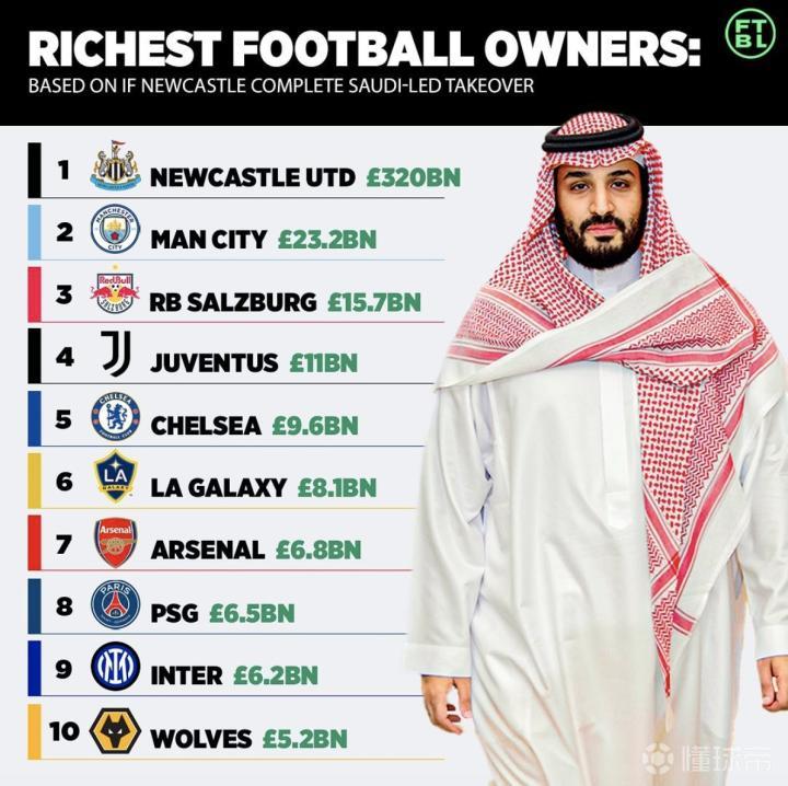 沙特财团正式完成了对纽卡斯尔联的收购,外媒盘点了全球各家足球俱乐部老板的财富榜,纽卡斯尔联老板排名第一,比第二位的曼苏尔财团多10倍。