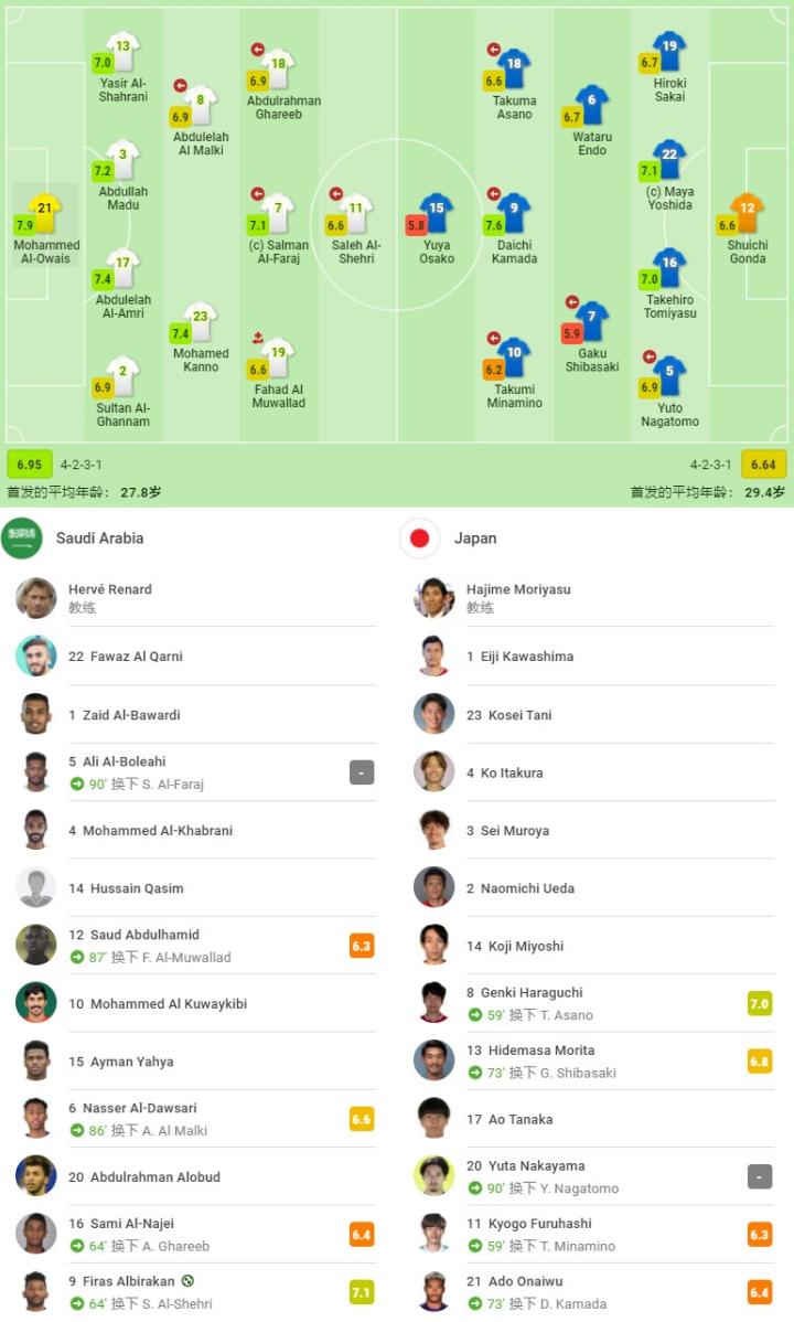 沙特阿拉伯首发:21-穆罕默德-奥韦斯、2-苏丹-加奈姆、17-阿卜杜拉-阿姆里、3-阿卜杜拉-马杜、13-亚西尔-沙赫拉尼、8-阿卜杜勒拉赫-马尔基(86' 6-穆罕默德-布莱克)、23-穆罕默德-卡努、19-法赫德-穆瓦拉德(86' 12-沙特-阿卜杜勒哈米德)、7-萨尔曼-法拉吉(93' 5-阿里-布莱希)、18-阿卜杜勒拉赫曼-加里卜(64' 16-萨米-纳吉)、11-萨利赫-谢赫里(64' 9-菲拉斯-布赖坎);