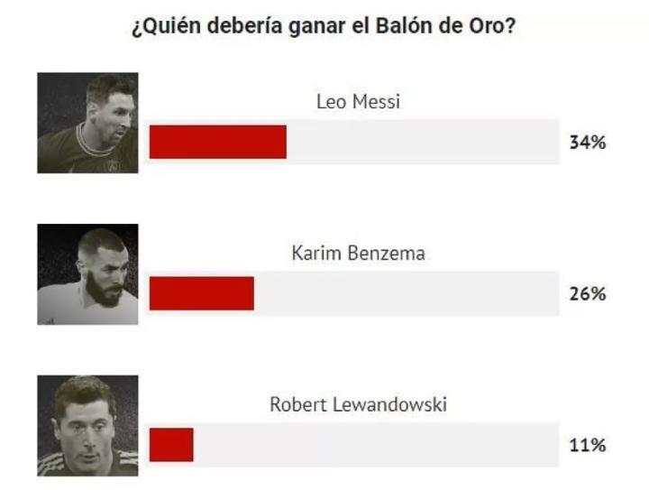 梅西以34%的得票率位居第一,《马卡报》表示:“这不出意外,我们要记住,这是阿根廷人的第7个金球奖,他赢得了美洲杯,还成为赛事MVP,他还和巴萨一起获得了国王杯。”