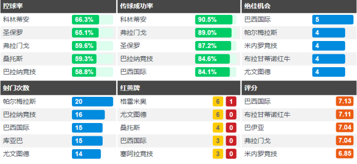 早场开球,巴西国际在主场尽情释放了自己的进攻火力,年轻中锋尤里更是成为闪耀的明星。开场仅2分钟,11号尤里就在门前大力补射破门,取得梦幻开局;第6分钟,10号泰森又在禁区右侧抽射得手,扩大领先;第36分钟,尤里在行进间倒地捅射入网,梅开二度;第40分钟,尤里又在禁区内倒地补射得手,完成帽子戏法!下半场一开始,尤里就打卡下班。第58分钟,国际小将18号卡多里尼头球破门;第61分钟和第82分钟,沙佩科人的17号麦克连进2球,避免一场惨败。