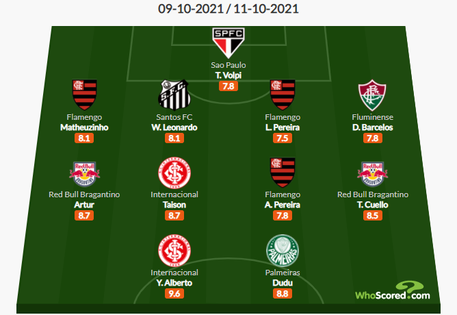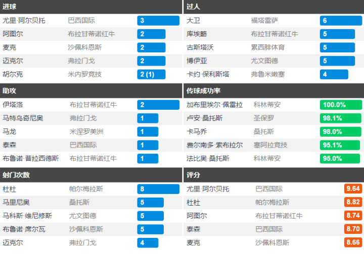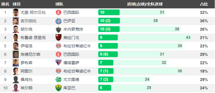 本轮占罢,巴西国际中锋尤里-阿尔贝托上演帽子戏法,以10粒运动战进球一跃升至射手榜第一;巴伊亚中锋吉尔伯托和米内罗竞技前锋胡尔克以10粒进球位居2、3位;弗拉门戈前锋恩里克和红牛中锋伊塔洛以9记运动战进球排名4、5位。