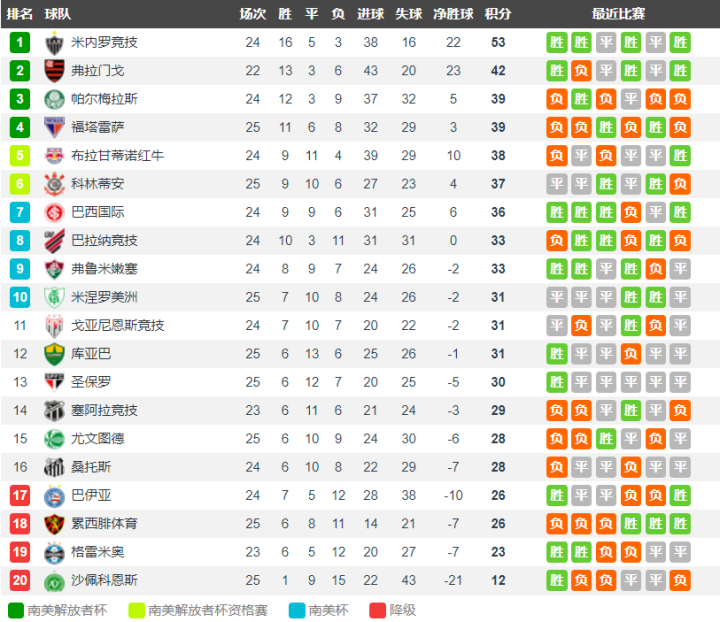 本轮占罢,积分榜前段,米内罗竞技取胜后继续强势领跑;弗拉门戈大胜后位列次席;同时输球的大绿和福塔莱萨仍居3、4位;积分榜后段,格雷米奥四轮不胜再次陷入危机;降级区的其他3席分别为巴伊亚、累西腓体育和沙佩科人。