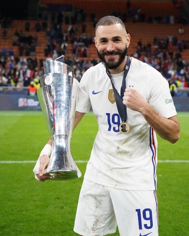 欧国联决赛,法国2-1逆转击败西班牙夺冠,赛后,此役进球功臣本泽马晒出自己手抱奖杯照,庆祝夺冠。