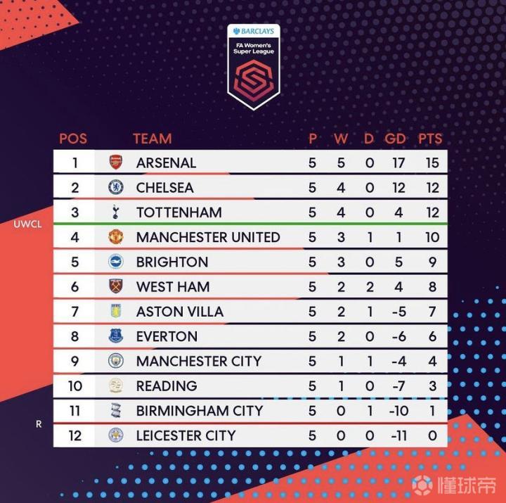 女足英超最新排行榜:阿森纳女足5轮全胜继续领跑积...北伦敦小酒馆 @懂球帝2021-10-11 07:42女足英超最新排行榜: 阿森纳女足5轮全胜继续领跑积分榜,排名第二的是切尔西女足,热刺女足与切尔西女足积分相同,净胜球少排在第三。曼联女足排名第四!展开更多
