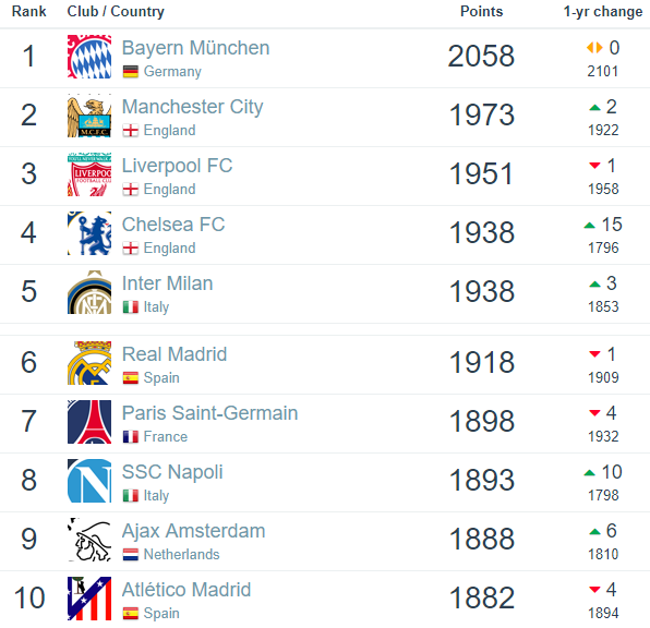 前十名依次为:拜仁、曼城、利物浦、切尔西、国米、皇马、PSG、那不勒斯、阿贾克斯、马竞。