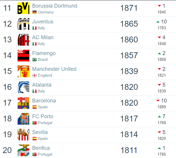 多特蒙德下降一位掉出了前十;上赛季表现优异获得意甲第三名但是本赛季表现平平的亚特兰大下降五名掉到了第16名;巴萨则是前三十名球队中下降幅度最大的球队,上赛季西甲排名第三而且欧冠止步十六强,目前世界排名第十七名;巴甲的弗拉门戈则是前二十中唯一的一支非欧洲球队,目前排名第14位;葡超双雄波尔图和本菲卡则是双双挤进了前二十名。
