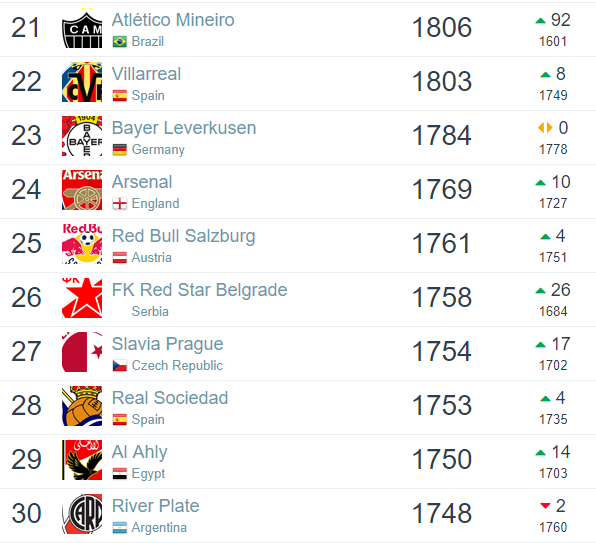 第21~30名依次为:米内罗竞技、比利亚雷亚尔、勒沃库森、阿森纳、萨尔茨堡红牛、贝尔格莱德红星、布拉格斯拉维亚、皇家社会、阿尔艾因、河床。