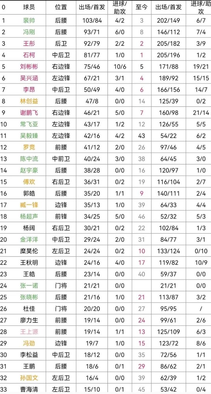 裴帅、冯刚在2016年以前是中超出场数据绝对的佼佼者,之后发展着实让人唏嘘不已。贺惯、傅欢、冯劲等人在此前不显山漏水,甚至无国字号出场记录,之后还是凭借自身努力进入过国家队。