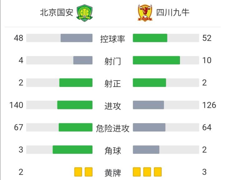 北京时间10月14日19:30,足协杯1/16决赛继续进行,北京国安对阵四川九牛。上半场,曹永竞长途奔袭助攻王子铭冷静推射首开记录,张佳祺尾声阶段头槌扳平比分。下半场,四川九牛屡次远射造险。90分钟战罢,双方战成1-1平,比赛直接进入点球大战。点球大战中,王子铭、肖鲲、刘欢与杨帆先后罚失,四川九牛门将杨超两度扑点。最终,国安点球大战2-3,总比分3-4不敌四川九牛,无缘足协杯16强。